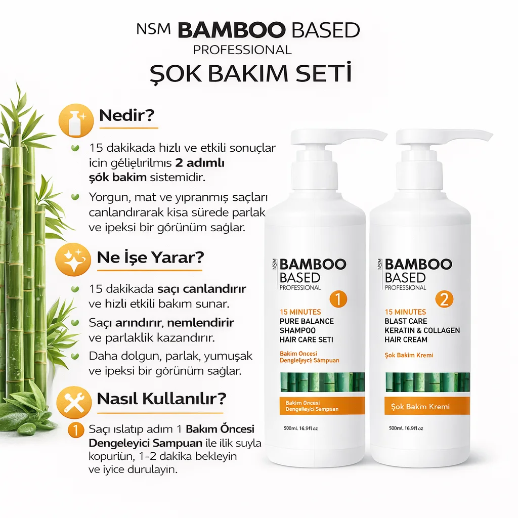 Bamboo Based 15 Dakika Şok Bakım, doğal bambu özleri ile zenginleştirilmiş, saçın derinlemesine beslenmesini sağlayan özel bir bakım ürünüdür. Saçınıza 15 dakikada yoğun bir bakım sunarak, görünümünü hemen canlandırır ve güçlendirir. Her bir 500 ml’lik şişe, saç tipinize uygun derin bir nemlendirme sunar ve saçlarınızın parlak ve sağlıklı görünmesine yardımcı olur.