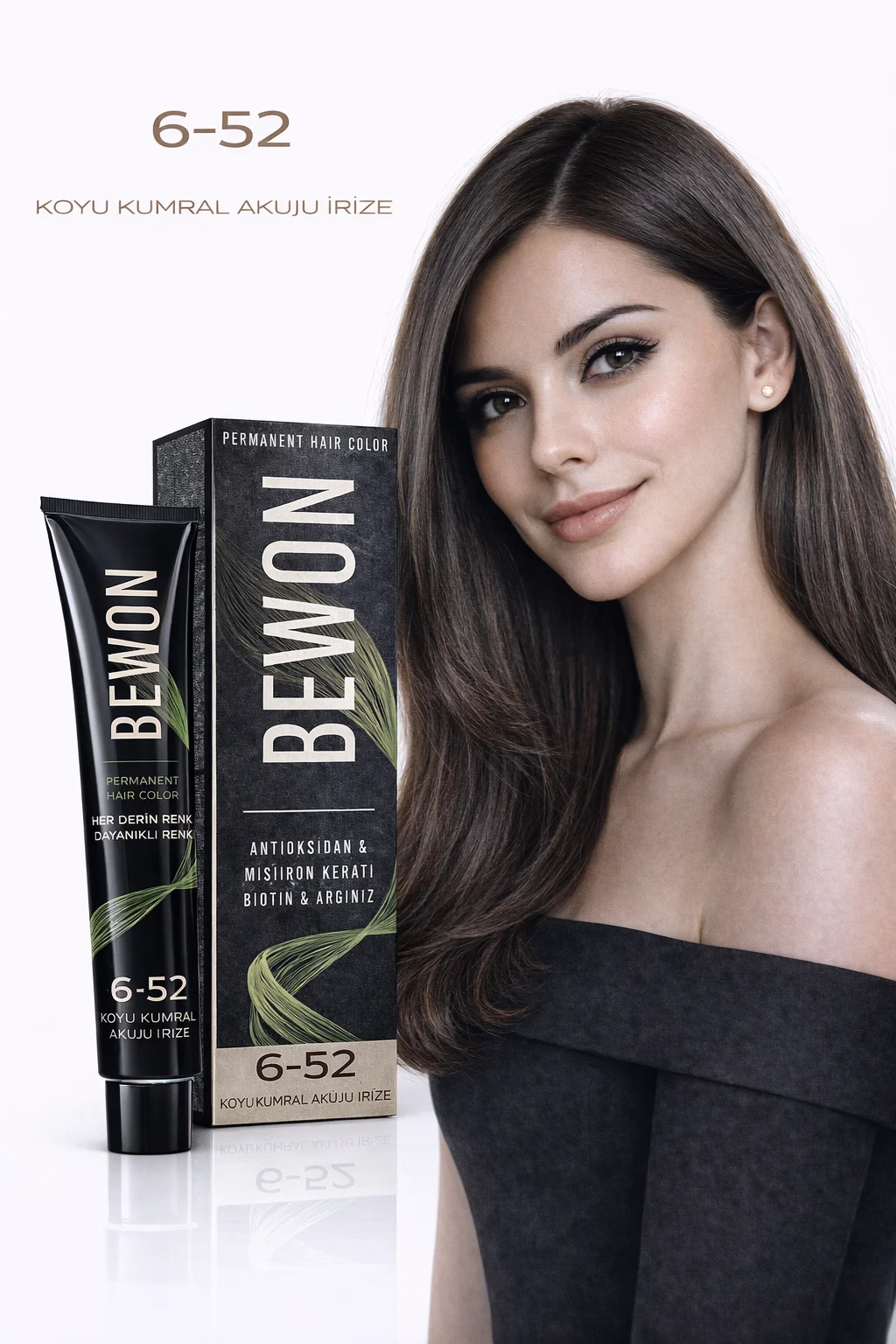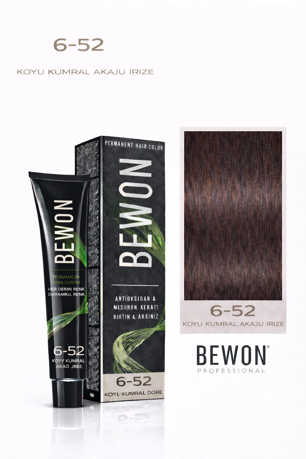Saçlarınızın doğal güzelliğini ön plana çıkaracak ve etkileyici bir görünüm kazandıracak olan BEWON Saç Boyası, 100 ml'lik ambalajında sizlere sunulmaktadır. 6-52 Koyu Kumral Akuji İri Ze rengi, derin bir ton ve zengin bir renk pigmenti ile saçlarınıza uzun süre kalıcı bir görünüm kazandırır.