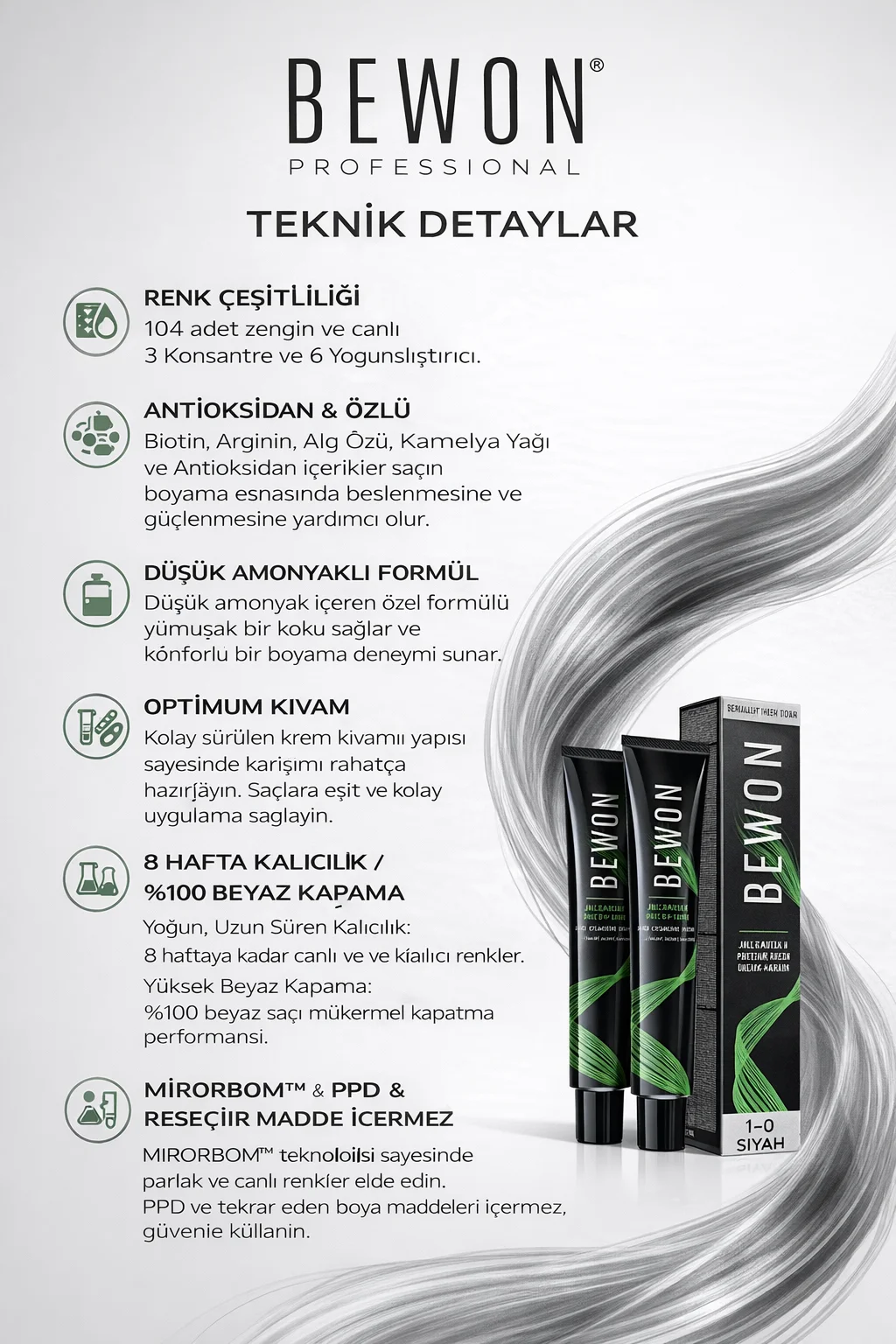 - Saç Sağlığına Özen: BEWON Saç Boyası, zengin besleyici içerikleri ile saçı besler ve korur. Saç tellerinde yıpranma ya da kuruma yapmadan muhteşem bir renk değişimi sağlar.