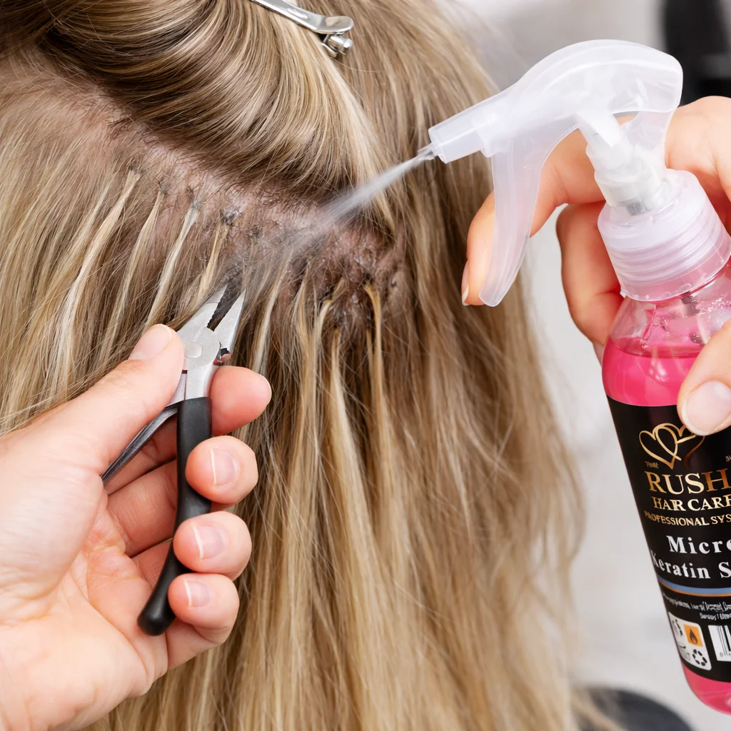 - Saçlarınızı ıslatın ve yeterli miktarda THE RUSH Mikro Keratin Sökücü’yü uygulayın.
