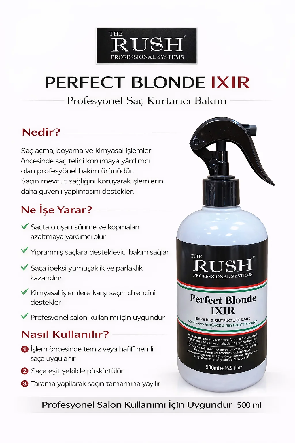 Üstün kalitesi ve etkili formülü sayesinde THE RUSH PERFECT BLONDE IXIR, salon kalitesinde bir bakım deneyimi sunar. Saç renginizi koruyarak, istediğiniz ışıltılı ve sağlıklı görünümü elde etmenizi sağlar. Aynı zamanda saç yapınıza zarar vermeden etkili bir bakım sunar.