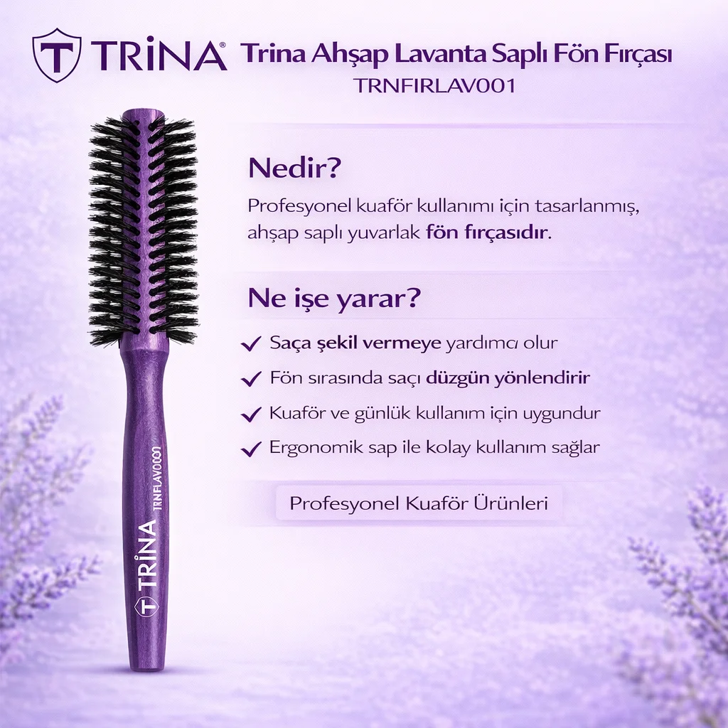 Trina Lavanta Serisi Ahşap Saplı Fön Fırçası (TRNFIRLAV010), kullanıcılar için hem şık bir aksesuar hem de profesyonel bir saç şekillendirme aracı olarak tasarlanmıştır. Eğer siz de stilinizi ön plana çıkarmak ve saçlarınıza dolgun bir görünüm kazandırmak istiyorsanız, bu fırçayı kaçırmayın. Saçlarınıza değer katmak için Trina'nın benzersiz tasarımı ve kalitesiyle tanışın!