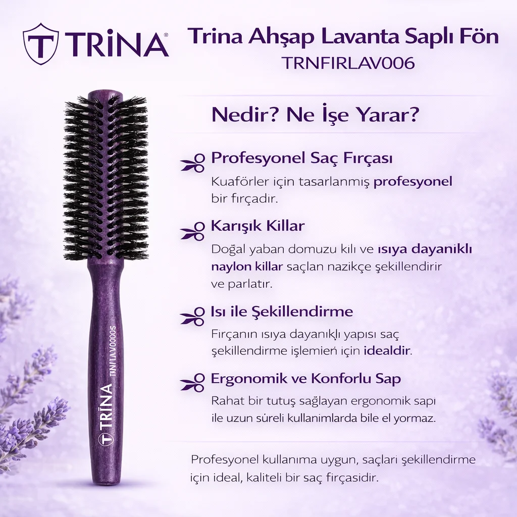 Trina Lavanta Serisi Ahşap Saplı Fön Fırçası (TRNFIRLAV010), kullanıcılar için hem şık bir aksesuar hem de profesyonel bir saç şekillendirme aracı olarak tasarlanmıştır. Eğer siz de stilinizi ön plana çıkarmak ve saçlarınıza dolgun bir görünüm kazandırmak istiyorsanız, bu fırçayı kaçırmayın. Saçlarınıza değer katmak için Trina'nın benzersiz tasarımı ve kalitesiyle tanışın!