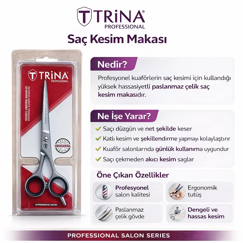 Ürün Fiyatı: Uygun fiyat seçenekleriyle sunulmaktadır. Kaliteli bir makas arıyorsanız, TRİNA SAÇ KESİM MAKASI sizin için ideal bir tercihtir.